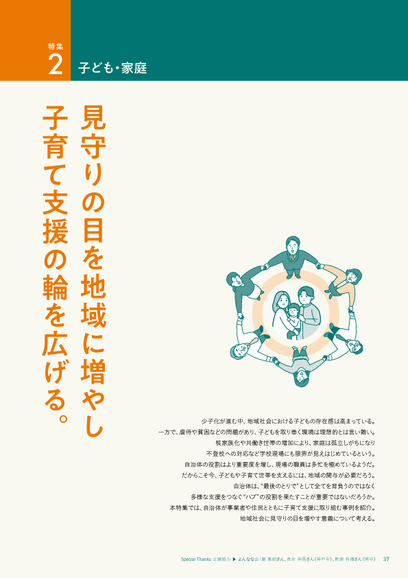 特集2[子ども・家庭] 少子化が進む中、地域社会における子どもの存在感は高まっています。一方で、虐待や貧困などの問題があり、子どもを取り巻く環境は理想的とは言い難い状況です。核家族化や共働き世帯の増加により、家庭は孤立しがちになり、不登校への対応など学校現場にも限界が見えはじめているといいます。自治体の役割はより重要度を増し、現場の職員は多忙を極めているようです。だからこそ今、子どもや子育て世帯を支えるには、地域の関与が必要でしょう。自治体は、“最後のとりで”として全てを背負うのではなく、多様な支援をつなぐ“ハブ”の役割を果たすことが重要ではないでしょうか。本特集では、自治体が事業者や住民とともに子育て支援に取り組む事例を紹介。地域社会に見守りの目を増やす意義について考えます。 |