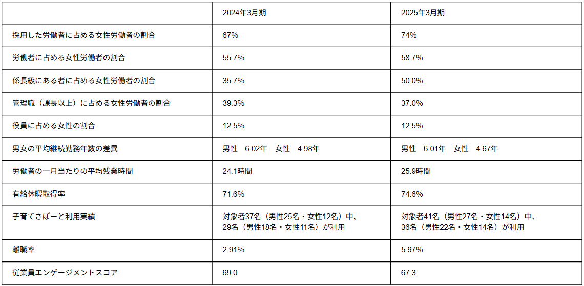 上記「多様性(女性活躍の推進に向けた取り組み)」及び「成果・実績データ等 従業員のモチベーションの状況」における2024年3月末および2025年3月末時点の当社の人事データは以下のとおりです。正規雇用の従業員のみのデータとなってい ます。