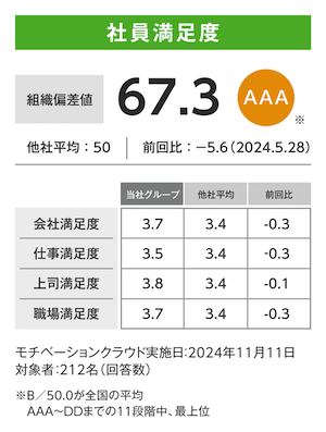 当社では、2019年7月よりモチベーションクラウド(注)を全社に導入し、組織状態を把握する指標としております。当社の組織スコアは最新時点のサーベイ(2024年11月11日実施)において67.3、6回連続AAAを維持しております。B/50.0が全国の平均、AAA~DDまでの11段階中AAAは最上位となります。